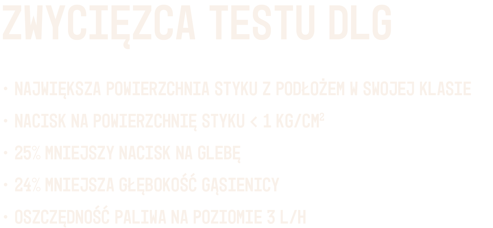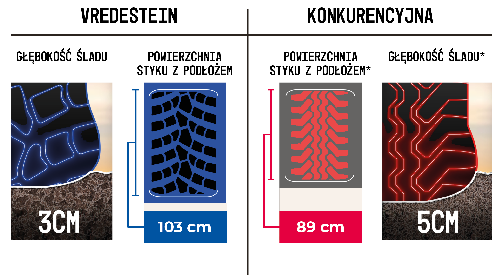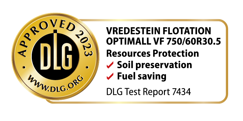 Zgodnie z testami przeprowadzonymi przez DLG w terenie, w porównaniu z konkurencyjną oponą VF. Testowane opony VF 750/60 R 30.5 z obciążeniem 7 100 kg i ciśnieniem w oponach dostosowanym do pracy w terenie przy maksymalnej prędkości 10 km/h (1,0 bar).