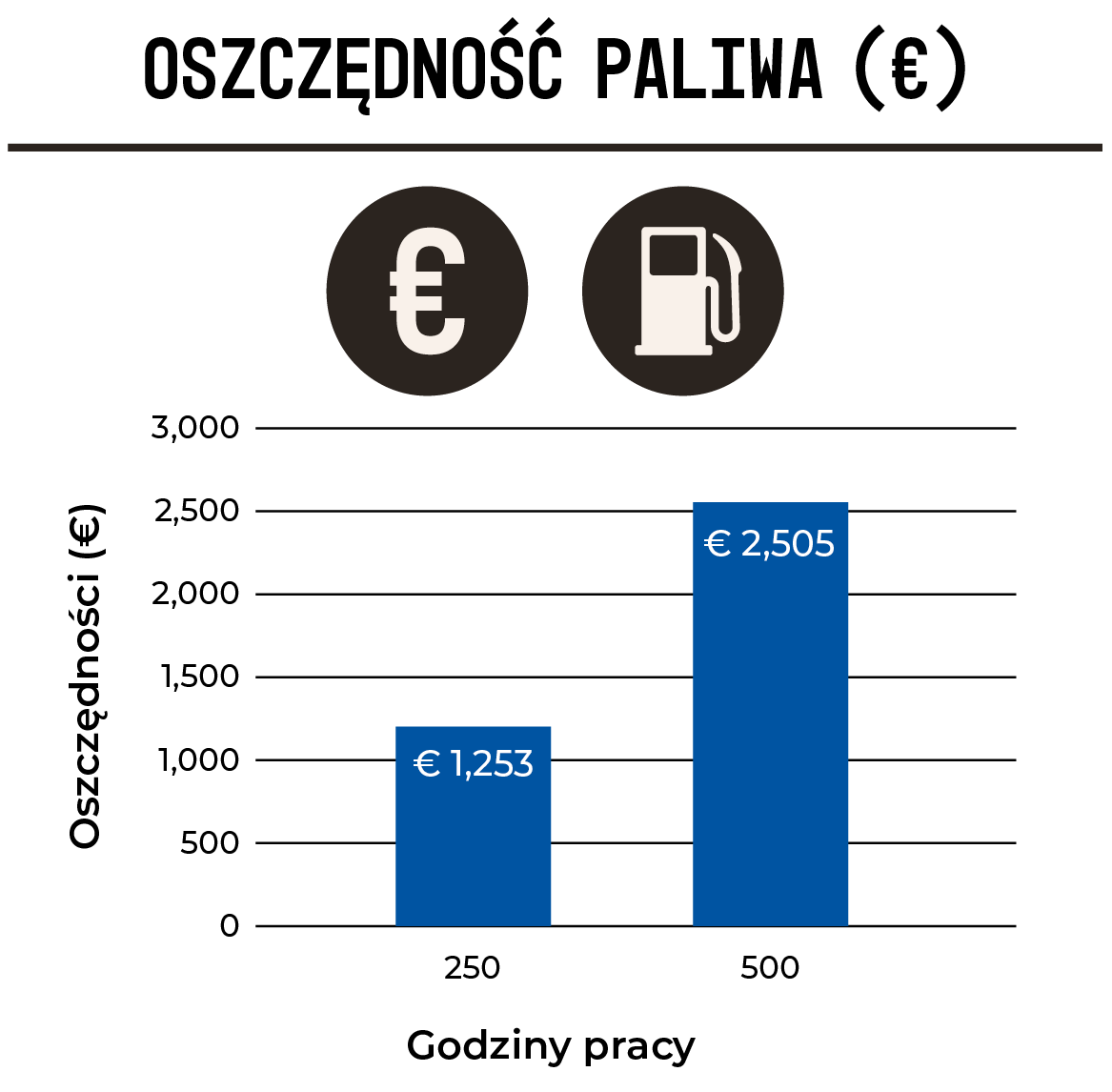 Zgodnie z testami przeprowadzonymi przez DLG w terenie, oszczędność paliwa na poziomie 3 L/H w porównaniu z konkurencyj- ną oponą VF. Założenie: Cena oleju napędowego 1,67 €/litr.